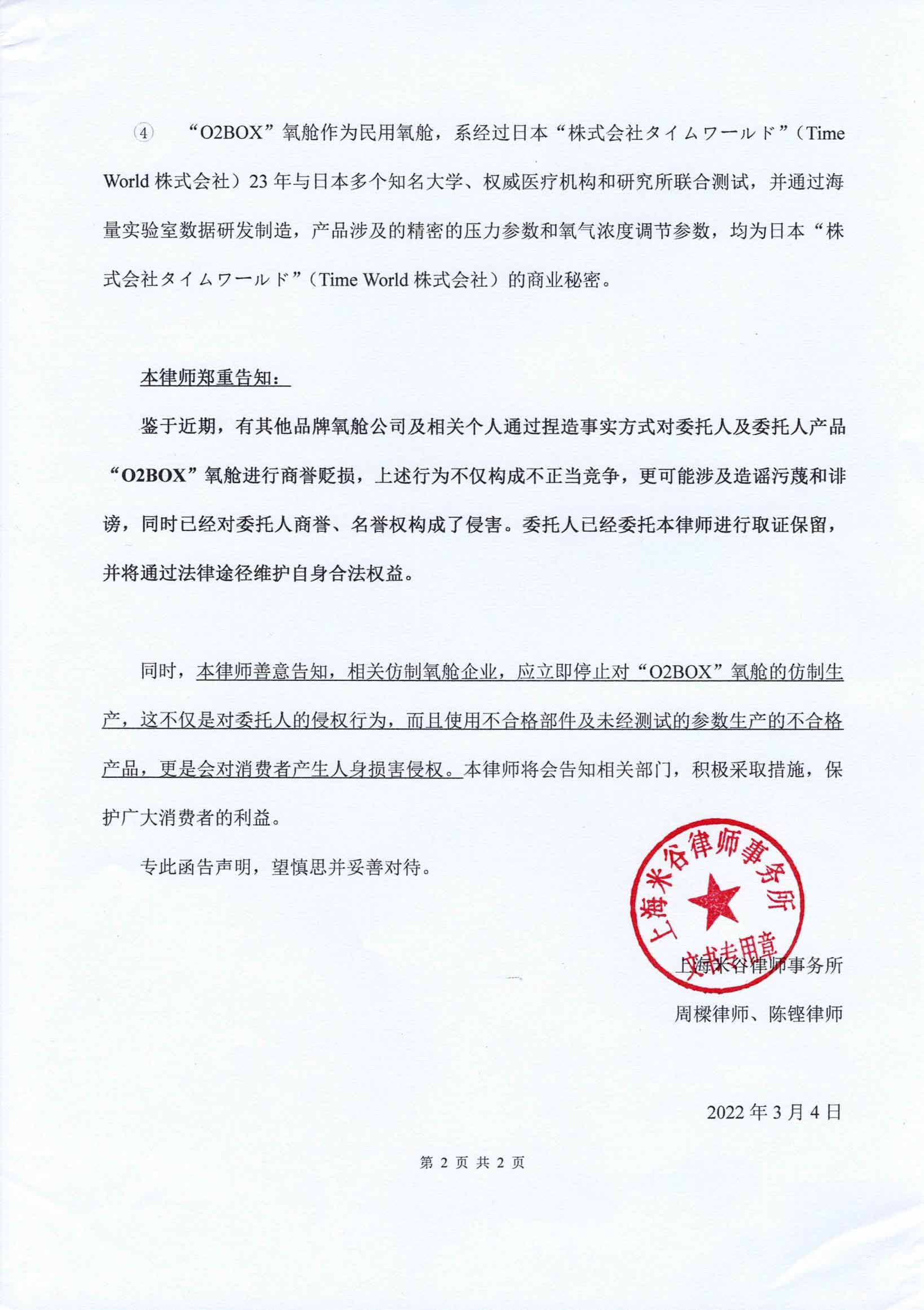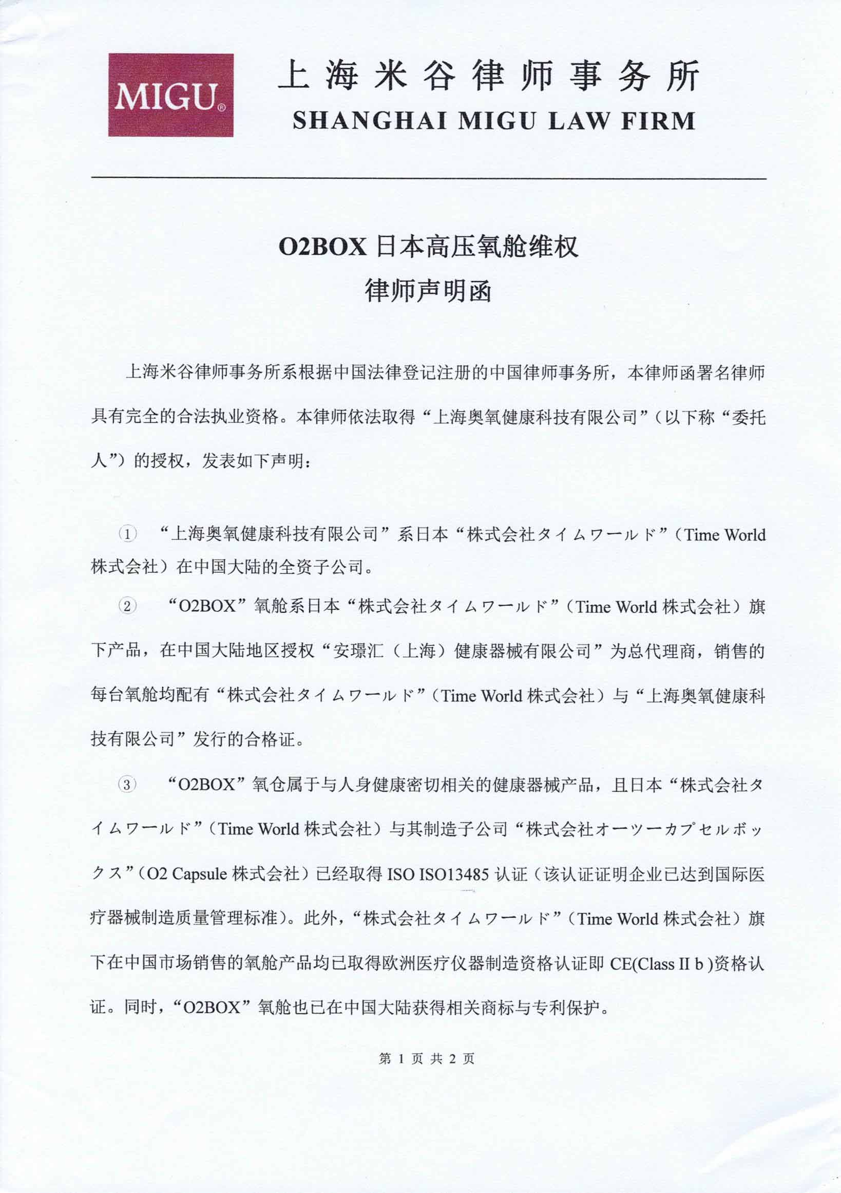 O2BOX日本高壓氧艙在中國維護合法權《O2BOX高壓氧艙律師聲明函》