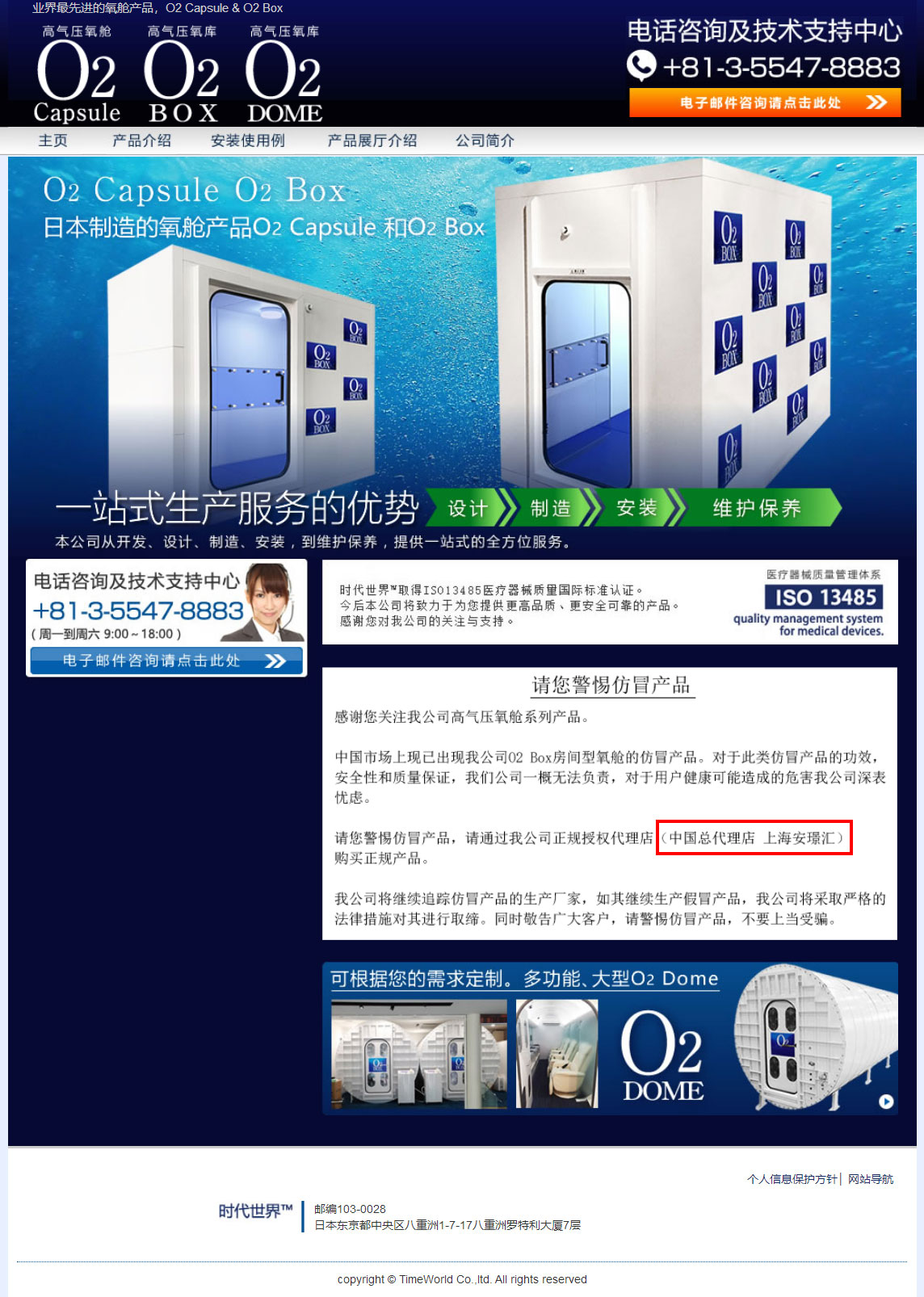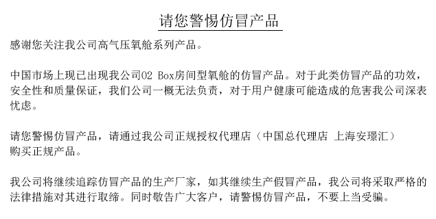 中國市場上現已出現我公司O2 BOX房間型氧艙的仿冒產品。對于此類仿冒產品的功效,安全性和質量保證,我們公司一概無法負責,對于用戶健康可能造成的危害我公司深表憂慮。