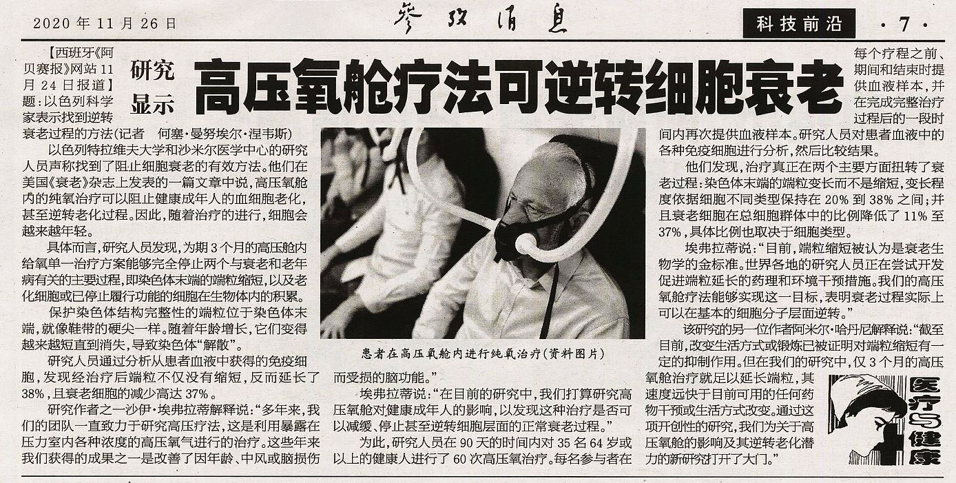 《參考消息》:高壓氧艙可逆轉細胞衰老